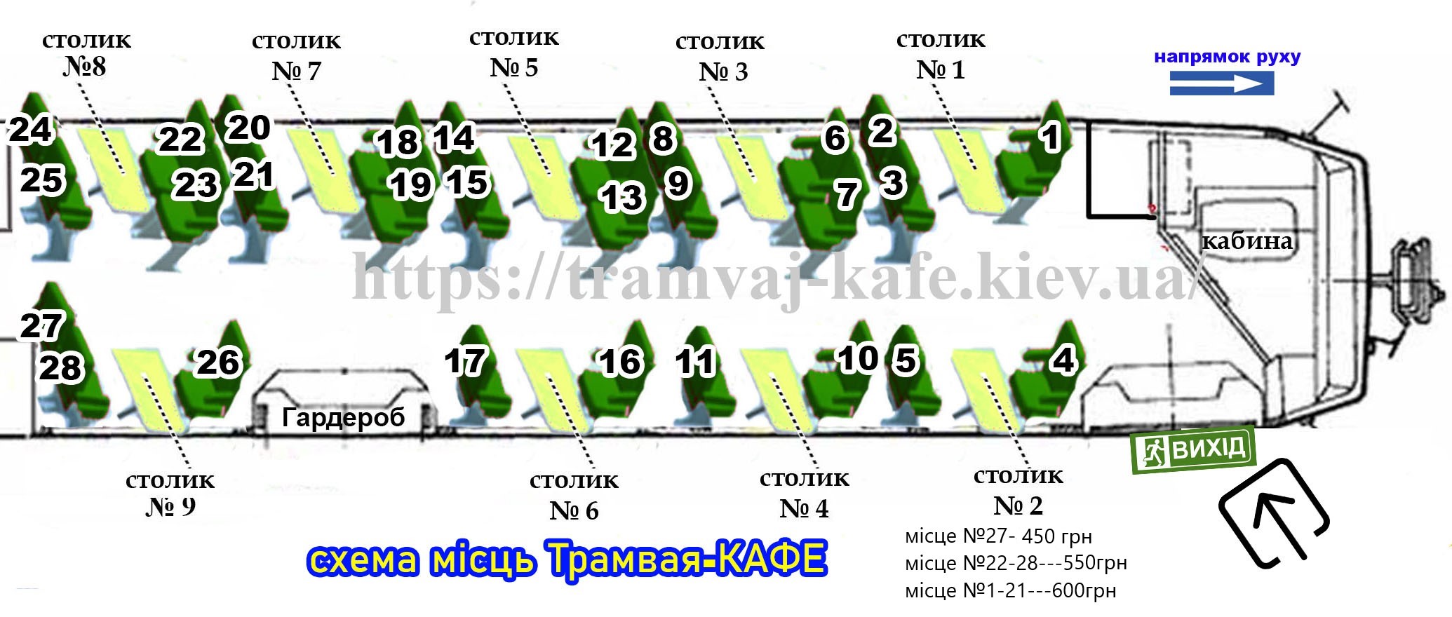 1,8,9 столики-3 місця, 2,4,6, столики-2 місця, 3,5,7,8столики-4 місця. Після бронювання місць Вам необхідно здійснити оплату протягом часу зазначеному в листі.